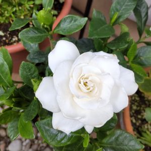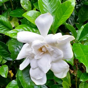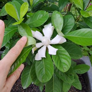 ガーデニア☘️生垣にしている八重クチナシの一番花咲きました。まだ1個しか咲いてないので、香りが漂うほどではないですが、近づくと甘い香りがします😊