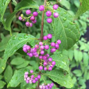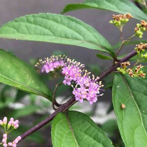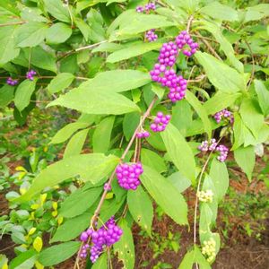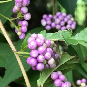紫式部が色づき始めました✨✨✨ かわいいなぁ〜💕💕💕 今年は、デレーンと長くなっちゃって通り道の邪魔になるので、縛られちゃってますが💦💦💦 紫のちっちゃい実は独特のかわいさですよね‼️昔、こんなのが小さい入れ物にいっぱい入ってる駄菓子あったな〜😁😁取り出すところが笛になってるやつ✨✨✨