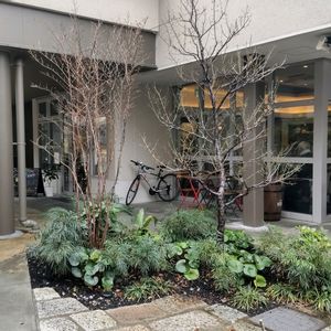 これから新芽が吹いてくる樹木と下葉の使い方が、 さすがプロだわ~とパシャリ。 どなたの造園作品かは知らねど、パチパチ👏👏 私が注目した葉っぱは、マホニアって言うのかな?秋田で見かけないのは耐寒性が強くないためらしい。オシャレなのに残念だわ〜。