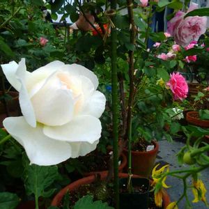 ベランダのバラ×アンティークボトル♡ (*´∇`*) ラベンダー色のバラ“ ラピスラズリ ”は まだまだベランダで咲いてるけど、 白い方の“ ボレロ ” はこれが最後の花。 キレイに咲いてくれてありがとうね✨ 2番花も期待してるよ〜(*´꒳`*)♪