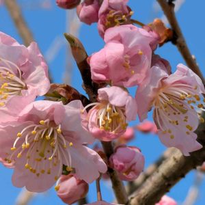 ツバキカンザクラ(椿寒桜) バラ科サクラ属 寒緋桜と支那実桜との種間雑種と考えられている🌸 松山市の通称"椿神社"の山門近くで見つけられ原木は神社に移植されている 和名は神社の名による🌸 早咲きで紅色がやや濃い🌸 花弁が内側に曲る盃状の一重咲き 長く数が多い雄蕊が目立つ 花期: 3月中旬 不稔性のため実はできない🌸