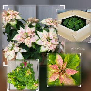 プリンセチア ロゼマーブルの短日処理中 左上↖️ 去年初めてお迎えした時 右上↗️ 短日処理始めた今年10月5日 下⬇️2枚今日の写真 昨年と同じ色にはなっていない😅 一枝だけ赤くなってる🙄 でも株の大きさは変わっていません🤗