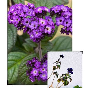 今日のお花『ヘリオトロープ』 ↖️大きい写真は 今年3月に買った時 右下↘️は今日の写真 一度切り戻したけれどまた枝が伸びて今も咲いていい匂いです。 小さい鉢は剪定した枝の挿木です。 挿木の方が葉っぱもお花も綺麗です🤗