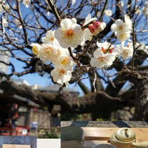 【お茶と花生活 水曜日】 日本茶専門カフェ「らふ」が 浦和にあります 今は梅が満開で メジロが遊んでいました 明治時代の納屋をリフォームし そこかしこに昔の物があり メニューの重石も分銅 そして一番の特徴がお釜が あり お代わり三杯位可能 今月のサービス茶荒茶440円 テラス席で頂いたお茶は 目の前の広々とした贅沢な空間 も込みのティータイムでした ※メジロとのコラボ写真は 難しく 飛び去った後の写真