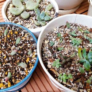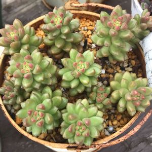 ピーチプリデが大きくなり、2号鉢ではギュウギュウ💦 なので植え替え。そうだ!寄せ植えにしよう。 去年葉っぱだけ頂いて芽が出た、エケベリア?葉挿し(名無し)多数あるので混ぜてみよう。 同じくらいの葉挿し(月美人、大和錦)も足して 寄せ集め丼💕 プリデの手前に、色々葉挿しっ子 隙間に斑入りタイトゴメ 、マジョール、プロリフェラ、ホワイトストーンクラプ、虹の玉葉挿しっ子 この寄せは、成長した半年後が楽しみだ😁🎶 雨前に作った寄せ植えなんだが 先日のpicのミニ工具箱寄せ植えも、天気になったら足してみようかな?