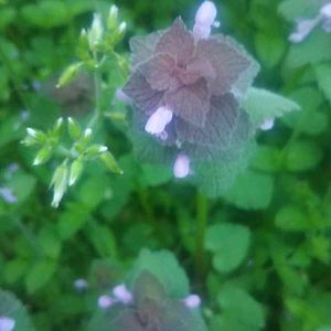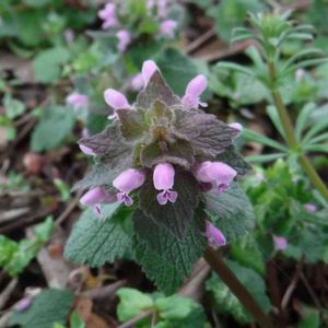 裏庭には・・・ヒメオドリコソウ 上部の葉が暗紫色になるものと、全体が緑色のものがある。単なる個体差だろうか?