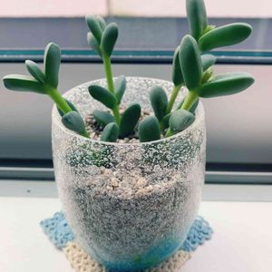 朝、玄関の掃除をしていたらランプランツを倒してしまいました😱 仮植えの葉挿しから伸び伸びの子だったので、半分のとこで切って琉球ガラスのコップに植え替えました。 暑いのでお家の中に置いて観察します。