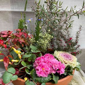 おはようございます😊 冬の寄せ植え💗 葉牡丹・ジュリアン・オキザリス・オタフク南天・斑入りブルーデージー・ギョリュウバイ・カッパーブロー・エリカ 園芸店で開催された寄せ植え教室で普段売られている苗が30種類ほどある場所で好きな苗を8種類選んでの寄せ植え💗 苗選びから楽しくて知らない方たちともアドバイスし合いながら楽しい時間を過ごせました🎶💕