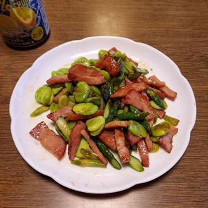 こんばんはー🌙😃 『飲んでもよろしいですか❔』 空豆が採れたので、男の手料理しました。 空豆、アスパラ、にんにくの芽が自家製です。 まいう〰️です❗ 今日もお疲れさまでした✨