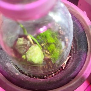 バナナパッションフルーツ。 もう、根が十分張ってきたようなので、そろそろ大きな鉢にと思ってみたら 保護するペットの中でコケがテラリウムのように育ってた... 7本生き残って全部順調なんだけれど。。。