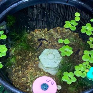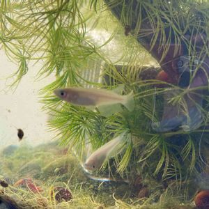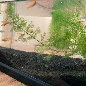 アクアリウムのマツモ 😊 バルーンモーリーという、メダカの仲間です。可愛いけどこれの飼育で結構時間とられます。庭作業も滞りがち😒 デカイのがお母さんで4センチ ホムセンで2匹買ったのですが、翌日メスがお子様28匹出産😲(店で妊娠してた) お子様たちは4ヵ月毎日4回ごはんを上げて育てました💦 お母さんはお子様が小さいウチは食べたりつつくもので😭私が育てたのです お母さんの口にはいらないサイズまで成長したので、親娘同居してます