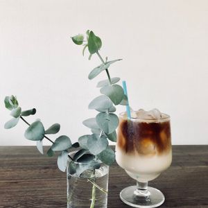 ユーカリが好きです💚 ベランダのユーカリがすくすく育って剪定したので、飾ってみました🌿💕 暑すぎてアイスコーヒーばかり…(笑)