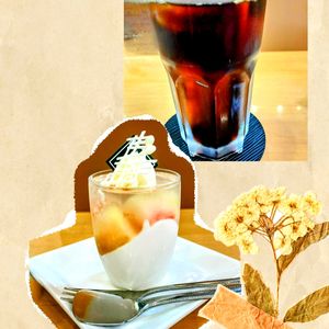 今日のオヤツ 🍑とババロアのゼリー アイスコーヒー🧉 井筒屋ケーキ屋さんに出前でcoffee shopに届けて貰い、アイスコーヒー🧉で、 頂きました。