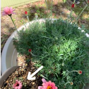 株分けしたガーベラが重なって咲いてます。。 挿し芽したローダンセマムがチラ見えしてますね🧡