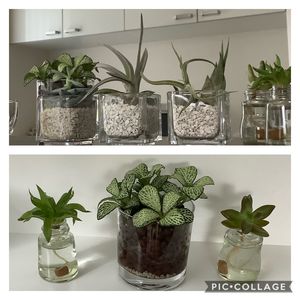 🌼キッチンカウンターの植物たち🌼 うちのキッチンカウンター上の植物たちです。 清潔重視で丸洗いできるものばかり。 キッチンカウンターの本来の目的、お皿の受け渡しとかはできない状況です。😅 下は水栽培のハオルチアとハイドロカルチャーのフィットニア。それから水栽培の銘月。 銘月、なかなか根が出なかったから、うまくいってうれしい。😄