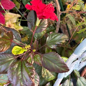 おはようございます🌿 今日のお花さん🌸 ハイビスカスフラムルージュ🌺 一輪目がやっと咲きました🌺 葉っぱも紅葉して来ました🍁 今日も素敵な1日を お過ごし下さい🍀