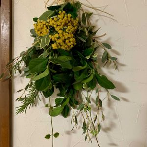 クリスマスリース 庭の緑と(青い実はアオキの実) いただいたグリーンアイス.スカイロケットで作ってみたわ リース台もアケビの蔓で作ったの(写真撮り忘れた) なかなかいいじゃないかしら