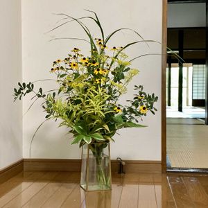 籠花 〜蔵カフェにて〜 秋の庭を籠に ススキ ナルコユリ ヒメヒマワリ2番花