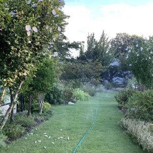 散水ホース 夫が工夫して散水ホースをセットしてくれた 朝一番.川の水をポンプアップして芝生に優しく散水してくれる 今まで.この暑い時期の 夕方の水くれは長くて重いホースを引っ張って回って大変な作業でしたが.とっても楽になりました 感謝感謝です!