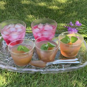 シソジュース&イチジクのゼリー 〜召し上がれ🥤〜 畑の赤シソでジュース🥤 1リットル×6本作って イチジクのコンポート入りのゼリーも作ったわ ②〜⑤ いただきもののイチジクを コンポートにしてみたの