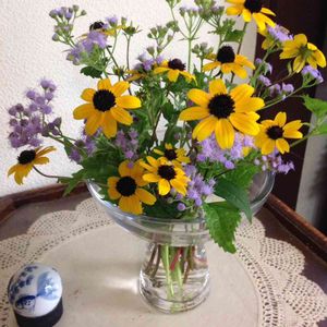 ルドベキアタカオ🌼 が 満開 でした💕 庭に 咲く小花を 集めて、生けました😄 ☆ ルドベキアタカオ🌼 ☆ ユーパトリウム ☆ オレガノ の花 ☆ サンジャクバーベナ ☆ アップルミント ☆メドウセージ ☆ セイヨウノコギリソウ です。