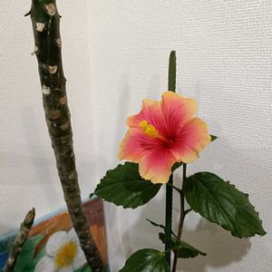 今日も悪天候で寒いけどお部屋のハイビスカスが又咲きました🌺 昨年、枝を切り挿し木した苗です。越冬を成功させて株を増やす事も マスターました✨️素直に嬉しい💖ハイビスカス品種「ミセス・ユミ」