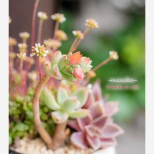樹霜さん、オレンジ色のコロンとした花を咲かせています。 可愛い。 でも、どこから花芽? (・ε・`o)? 花をカットするにはどこからカットすればいいのかな? このびよ~んとした樹霜さんを、まるっとカットするのは切ない… バランス崩れちゃうな~ 紅稚児さんは、そろそろ花が終わりらしく、色が茶色くなってきたので、既にだいぶカットしましたよ。 (*^-^*) 【masakoの多肉No.45】