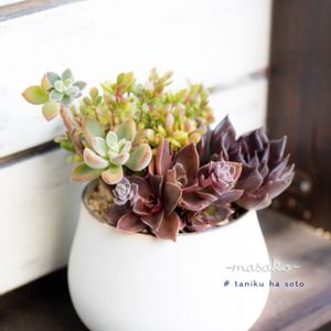 新作( 〃▽〃) 黒い多肉が気になっていて、 ある晩、急にイメージがわいてきて、 眠れなくなった…バカな私。 頭が多肉脳…。 即、迎え(買い)に行きました。 大事にとってあった、TOKIIROさんのところで買ってきた鉢に植えたよ! 【masakoの多肉No.45】