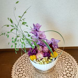 こんにちは😊☁️☔🌻🌹🌿 台風が温帯低気圧に変わったそうです。でも大気不安定で大雨が降ったりする地域もあるようですね。明日はまた雨雲発達するようでかなり雨☔が降るとか。短時間記録大雨とかは怖いですよね。気をつけましょう。 こちらは先日作ったいけばなと一緒に作ったもうひとつの作品です👍💕こちらは紫系統のお花でまとめました。グラジオラスの存在感が凄い!いろいろな色のグラジオラスがあったのですが印象強い紫を選んでダリアも紫にあう色のダリアにしました。写真だけ少し暗めが残念ですが…お花のコンディションが優先なので作った翌日に📸✨ 追記 小判草と教えていただきました✌️😆✌️