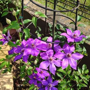 クレマチスがたくさん咲きました💕(名無しさんです) 一代目はいつの間にか枯れ、二代目の2年目でやっとちゃんと咲いてくれました💜(小ぶりですが🙂) 良く調べてちゃんとお世話しなくちゃ💪‼️