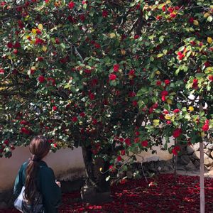 八重椿 常緑樹なので樹下はいつも日影に成り、山野草エリアを形成するのに役立っています🎵