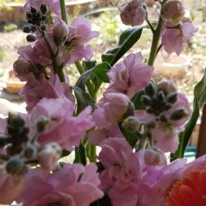 お花屋さんでストックの切り花を。 種まきしたストックは 八重咲きにはならないそうですね。 でも、私は一重咲がすきです♡
