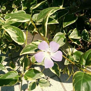 斑入りの多年草ツルニチニチソウ、今年の2輪目咲く、やはり花数少な 花数多いニチニチソウの方は。古い葉が半分枯れたあと、新しい葉っぱが、四方に伸びだしている