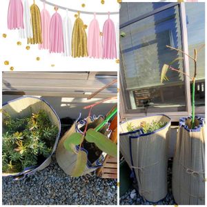 こんにちは😄になっちゃったかな? コチャニャチワ~にします😂 なんか、私だけですかね😅 今年は寒く感じており、レモンユーカリさんは耐寒管理限界がゼロ℃! それを越えると枯れてしまうと言うことで、本来お部屋に入れるべきなのですが😅 こんな大きな鉢はお部屋には置くところありません😭 となり、本日、切り戻しをし、ゴザを巻き×②しました😄😁😅 お隣のデビルズ👿さんもご一緒に😁 一応、光と風&お水をあげれる様に上部は開放してます😁 根っこが枯れなければ新芽を出せる力のあるこのお二人なので、これで様子見ますね😄! ※コザを巻くと虫が冬眠しそうで怖くて無理なんですが、植物さんのために心を決めまた💦 春先は母にお願いして外して貰いますね😅