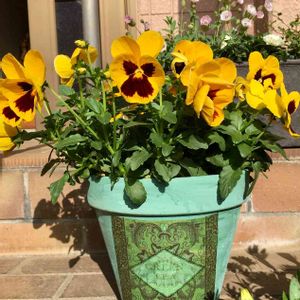 パンジー💘長く咲いてくれてます たくましい生命力があるお花💕 元気を分けてもらってます😆ありがとね〜😍もうちょっと🤏咲いてて欲しいから リメイク鉢に植え替えました😍 黄色い花色とのコントラストがgood👍 頑張れパンジー💛💛💛
