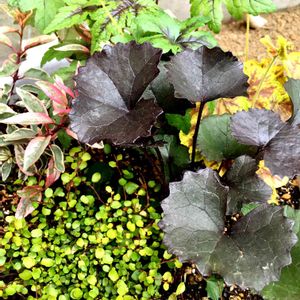 皆さまこんばんは🌆 日陰のほうが元気な子たち👍 5月の日差しで葉焼け😎しないように 北側の庭へ避難です〜🚑💨💨💨 ヒューケラ リグラリアミッドナイトレディ ティアレアと おまけのワイヤープランツと 名前がわからないカラープランツ😅