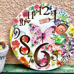おはようございます😃 ニトリの時計が壊れましたので リメイクでペーパーナプキンを使って お花畑風にしてみました💖 ムスカリ・ビオラ・水仙・藤 ヘデラ・薔薇・ラナンキュラス アネモネ・ナスタチウム・百合・ベリー などなど💕 ペーパーナプキンも凄い種類😆 何処に飾りましょう💖