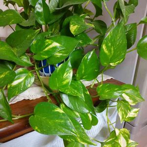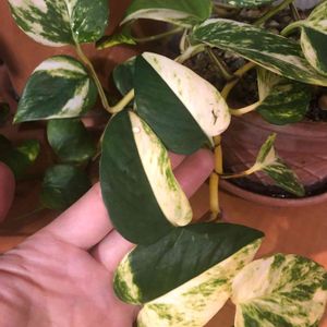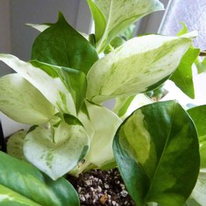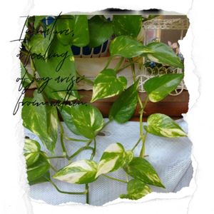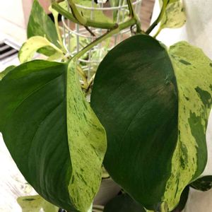 ポトス。 新芽の時は葉全体が斑入りなのに、大きく育つと半分だけ斑入りになり、さらに時間が経つと斑入りが無くなります。 不思議なポトスです。 昔のアニメにこんな顔の敵キャラいたな〜と思いながら育ててます。(マジンガーzのアシュラ男爵!?)