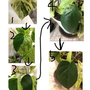 不思議なポトスにコメント頂いたのでこんな感じで変化していきますよ〜画像。 違う葉っぱなので少し分かりにくいですが同じ株に現在付いている葉っぱです。5が一番の古株葉っぱです🌿 結束バンドで止めているせいなのか日当たりのせいなのかよく分かりませんが5枚に3枚の葉っぱはこんな感じになります😅