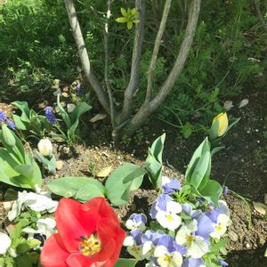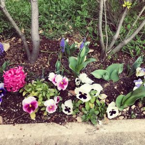 後ろが荒地で雑草まみれだけど、お花が増えてきました❤️ チューリップが一気にピンクになった🌷 ヒヤシンスもピンクでかわゆす💕 パンジーも花数がふえた💖