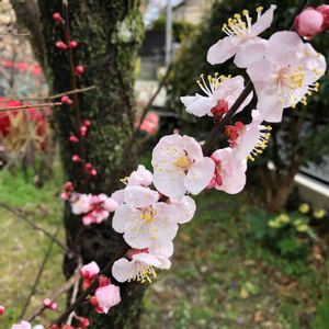3/3㈬⑤ 🏷似ている植物図鑑 杏の花に出会いました!! 梅?と花を見て思い、 桜に似た幹、枝に縦の筋… 花びらは丸いから桃ではないし… ピカピカさんが言っていたのと同じかも。 あ💡スモモかアンズ 調べてみたら杏の花でした〜😃 スモモの花は白でした。 『みんなの花図鑑goo アンズ[杏]』より抜粋してまとめると ✤花色は淡紅色と白があります。 ✤花びらは丸くて5枚。 ✤樹形が直立しています。(樹形は桃に似ています) ✤樹皮に縦の筋が入ります。 ✤赤い萼が反り返ります。 ✤耐寒性があります。 ✤日本には奈良時代に伝えられたと言われ万葉集にも唐桃(からもも)の名で登場します。原産地は中国です。 世田谷の祖父宅に杏の木がありました。 花はもっと濃いピンク色でした。幹や枝には忘れてました😅 実が沢山なってアンズジャムを作るのに大量のお砂糖使ったのは覚えています。そのままは熟れていてもかなり酸っぱかったようです😆私はそのままは食べませんでしたが叔母さんが食べて「酸っぱ〜い!!」と言ってました🤣🤣🤣 ちなみに桃の花は花びらの先が尖っています。