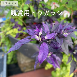 観賞用トウガラシ🌶 トウガラシの仲間ですが、食用ではなく、見た目の美しさに特化した品種です。 色鮮やかな実は細長いものから丸いものまで 様々な姿があり見る人を楽しませてくれます。 また最近ではカラーリーフとして葉も利用されています。 写真の観賞用トウガラシは、黒紫色の葉が特徴的な品種です。 白やオレンジなど明るい色の花に対して引き締め効果があり、相性は抜群!✨ 暑さに非常に強いため、夏の寄せ植えで大活躍してくれますよ。