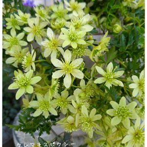 ❁︎寄せ植えの中より❁︎ クレマチス 天使の鈴 次々 開花 グリーンがかったお花が 魅力です。 (奥はティアレラ・アネモネ)