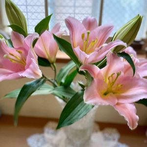 毎週玄関先に飾るお花 今週は花弁が落ちない百合 甘い香りに癒されます