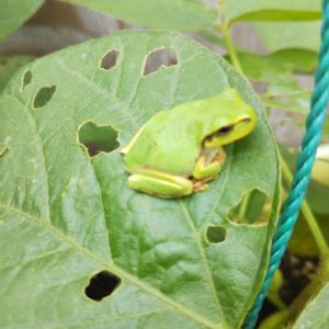前の自宅の園芸達人も🥺間違いか、ササギとして小さい苗もらったが枝豆でした。ビール🍺のつまみ一回分にはなりそうかな⁉️農薬等してないから、芋虫から葉が食べられてましたが、枝豆番人にビッキ(蛙🐸)がいつの間にか来てました。ちょっとお腹がふっくらと、満腹の表情になってます。