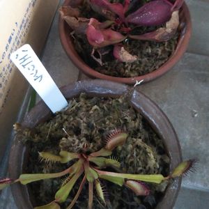 ハエトリソウとサラセニアです。日本海側暴風雨警報発令中❗️午前中の晴れ間見計らい、囲いからとってきました。初めての年越しに😀成功したみたいです。(buKkieさんのお陰です)たぶん生きてると思います。植え替えしようと思たが、駐車場の囲いの作業所は、風🌀通し良すぎる建物、今日はここに待避して、外の天気見ながらやります。