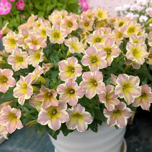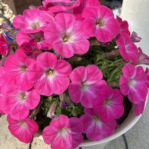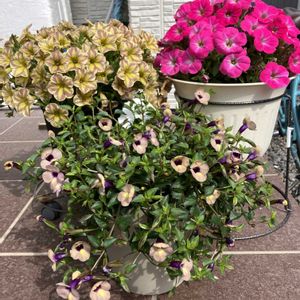 ①🔰とらネコ ✂️から2週間でフワフワに復活…葉っぱもこれまでのサフィニアとは違うね モリモリに咲かせるにはどうしたら良いのかな? フワフワで良いか〜😆 ②2連100円レスキュー🛟のももちゃん 8号鉢いっぱいになり咲き始めました 今年はモザイクでかわいいハートを見られなかったけど、この子達はハートです🥰 ③パルフェストロベリーとイチゴショートのイチゴのMIX サフィニアとカリブラコアだから一緒に咲かないね💦 パルフェが満開過ぎたので✂️したらイチゴが咲き出しました