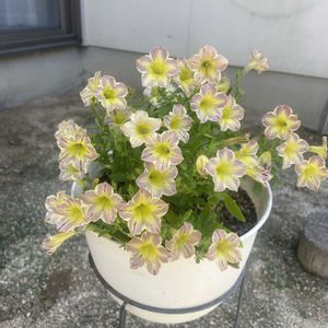 おはようございます🌞 サフィニアアート とらネコ🐯 今年はなかなか上手く咲いてくれません😅 あっちこっち向いてまとまらないです。 ふたつ変わった色のが咲いています。 キメラ咲きかな? 一度カットしようと思います☺️