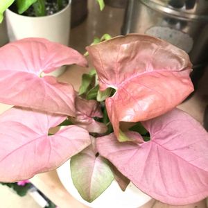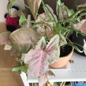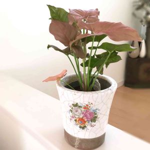 少し前に気に入ってこのポットを2つ買ったのですが、なかなかしっくりくる葉っぱがなくて忘れていました。 先日、偶然見かけたシンゴニウムの色が似合いそうでお迎えしました。 スモーキーピンクが可愛いです。