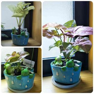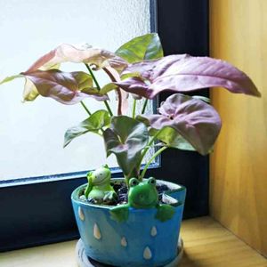 とうとうこのカエル容器に底穴を開けてしまいました。 水受けも下に置きました。 でもそれで植え替えした新しいシンゴニウム(少しピンク色が混ざっているやつ)を余裕を持って植えることができました。 まだ小さめですが、すぐに成長してカエル🐸の傘になってくれるかと思います。 このトイレの窓際は適度に陽があたって、植物を置くにはちょうどいい感じなんですよ。